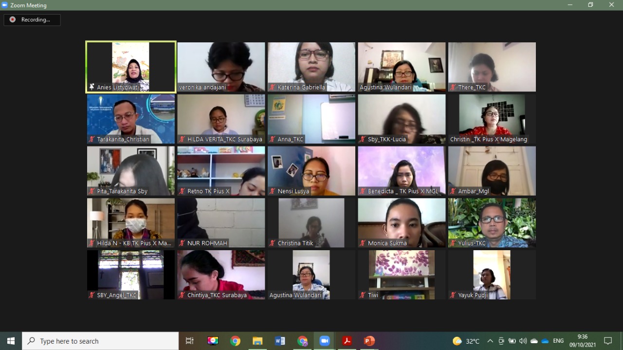 TK RA. Kartini – Sabtu, 9 Oktober 2021 TK RA. Kartini Tarakanita, KB-TK Santo Carolus Tarakanita, TK Tarakanita Solo Baru, dan TK Pius X Magelang mengadakan kegiatan Hari Studi Guru ( HSG ) secara virtual zoom dengan tema “Guru Hebat Berani Menulis”. Narasumber untuk sesi yang pertama adalah Anies Listyowati, M.Pd dengan moderator Katerina Gabriella, S.Psi (Pendidik dari TK RA Kartini), sebelum sesi pertama dimulai Ibu Agustina Tri Wulandari, S.Pd selaku Kepala TK RA Kartini menyampaikan terima kasih atas semangat Guru dan TU dari TK Tarakanita wilayah Surabaya dan Jawa tengah, semoga melalui pelatihan hari ini kita semakin percaya diri dalam berkarya dalam sebuah tulisan sehingga menjadi ajang promosi sekolah.
