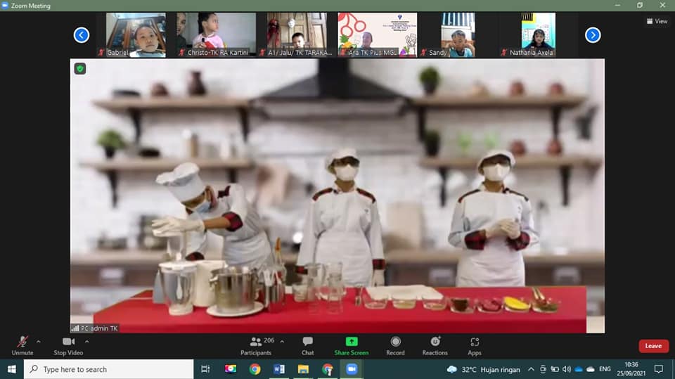 PJJ Lintas Wilayah jenjang TK via zoom diikuti oleh peserta didik KB-TK Pius X Tarakanita Magelang, KB-TK Tarakanita Solo Baru, KB-TK Tarakanita Bumijo Yogyakarta, TK RA Kartini Surabaya, dan KB-TK Santo Carolus Surabaya. PJJ jenjang TK ini bekerjasama dengan kakak-kakak dari SMK Pius X sebagai narasumber. Kegiatan dengan tema “Healthy Juice” dilaksanakan Sabtu, 25 September 2021 Pukul 10.00-11.00 WIB. Dihadiri oleh kurang lebih 203 peserta didik dengan didampingi orang tua. Dengan moderator Retno Purbo Sari, S.Pd (Kepala Sekolah TK Pius X) yang membawakan suasana di ruang zoom sangat atraktif, peserta didik dipandu untuk mengikuti kegiatan langkah-demi langkah. Diawali dengan doa, video perwakilan anak dari masing-masing sekolah yang menceritakan singkat tentang makanan dan minuman kesukaan, bernyanyi sambil bergerak seru-seruan sebelum acara puncak. Dan taraaa….tibalah pada saat yang dinanti-nanti, kakak SMK menjelaskan cara membuat jus sehat dari campuran bahan bayam, apel, nanas, gula cair yang diblender dan jadilah Healty Spinach Juice serta bahan ke-2 alpukat, manga, gula cair, susu yang diblender jadilah Delighy Juice. Moment yang mengesankan bagi kami adalah saat anak mempraktekkan dengan suara yang ramai dan kerjasama yang solid dengan orang tua saat nge-jus membuat suasana terlihat hidup. Setelah finishing anak-anak diajak untuk menghias-nya, ada yang dicampur dan ada yang dipisah. Setelah ditunjukkan bersama mereka tak sabra untuk meminumnya, Heeemmm…..yummy!!?