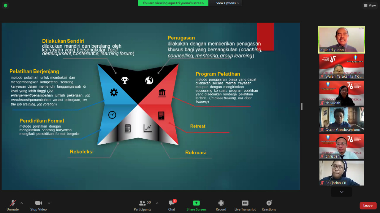Kamis, 19 Agustus 2021, Pk. 09.00-11.00 Wib, secara virtual seluruh staf Tata Usaha (TU) Yayasan Tarakanita wilayah Surabaya baik yang ada di kantor wilayah dan di unit sekolah mengikuti pertemuan perdana tentang pengembangan diri TU. Acara ini dibuka dengan pengarahan yang disampaikan oleh Sr Yudith, CB (Kepala Kanwil Surabaya) antara lain,perlunya pengembangan diri TU yang dirasa sangat kurang disetiap unit, kita rindu bertemu dan bekerja di unit, rindu kebersamaan, Karyawan/SDM adalah aset organisasi yang harus dikembangkan dan TU harus mengalami pengembangan 35 jam/tahun. Maka Kepala Bagian SDM (Agus Tri Yuono) mengundang para TU untuk merancang pengembangan diri sesuai dengan bidang yang digelutinya, dan menurutnya jika kapabilitas SDM meningkat, maka kinerja organisasi juga meningkat (efektifitas). Beliau menjelaskan bahwa Core bisnis yayasan Tarakanita adalah pendidikan dan kekayaan organisasi yaitu Duit, Orang, dan Aset yang disingkat (DOA) menjadi kata kunci yang selalu didengungkan didalam acara ini. Karena pertemuan perdana ini sangat menarik minat para peserta hingga beberapa TU bertanya dan memberikan ide-ide yang cemerlang.